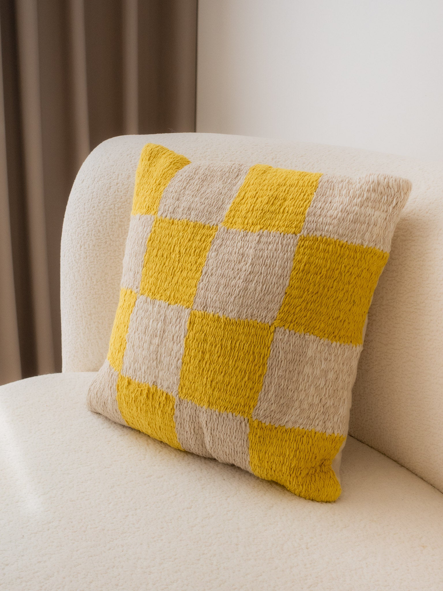 Cojin a Cuadros Tejido a Mano Amarillo.