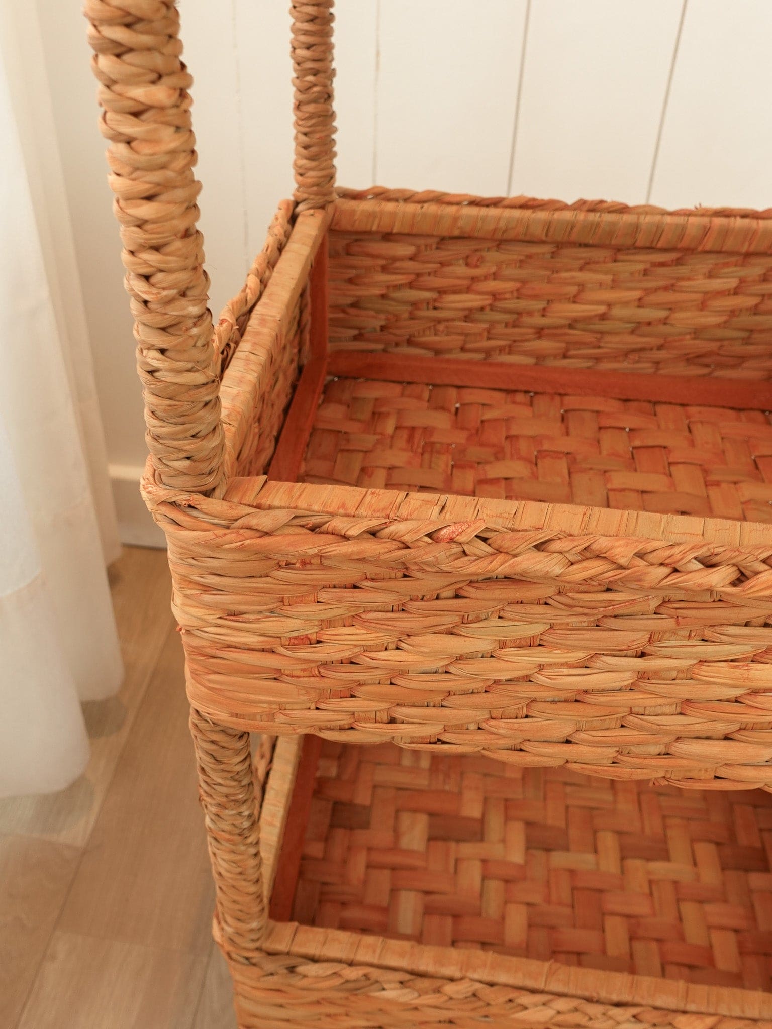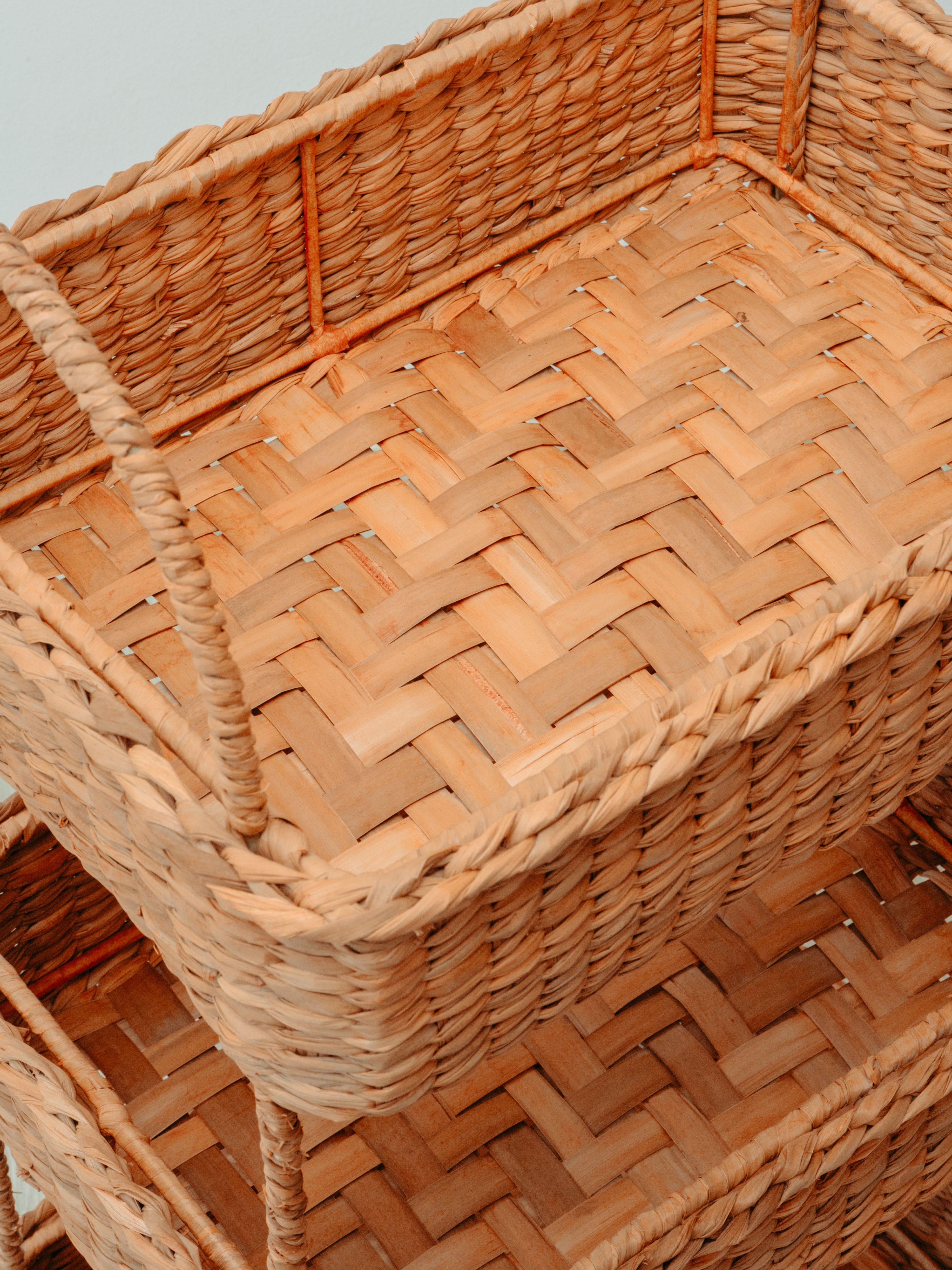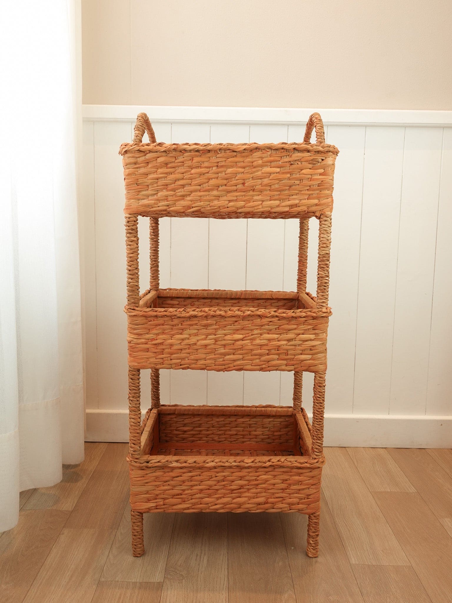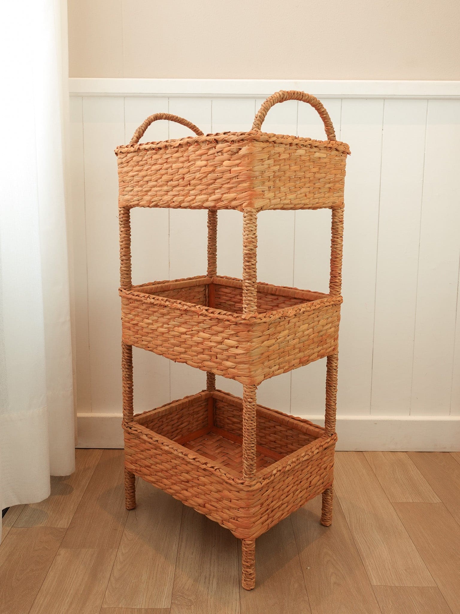 Organizador con tres niveles, tejido con palma de enea; utilízalo en la forma que prefieras, ya sea para darle un lugar a tus bolsos, toallas o frascos. También puedes ubicarlo en tu zona social como mesa auxiliar decorativa.