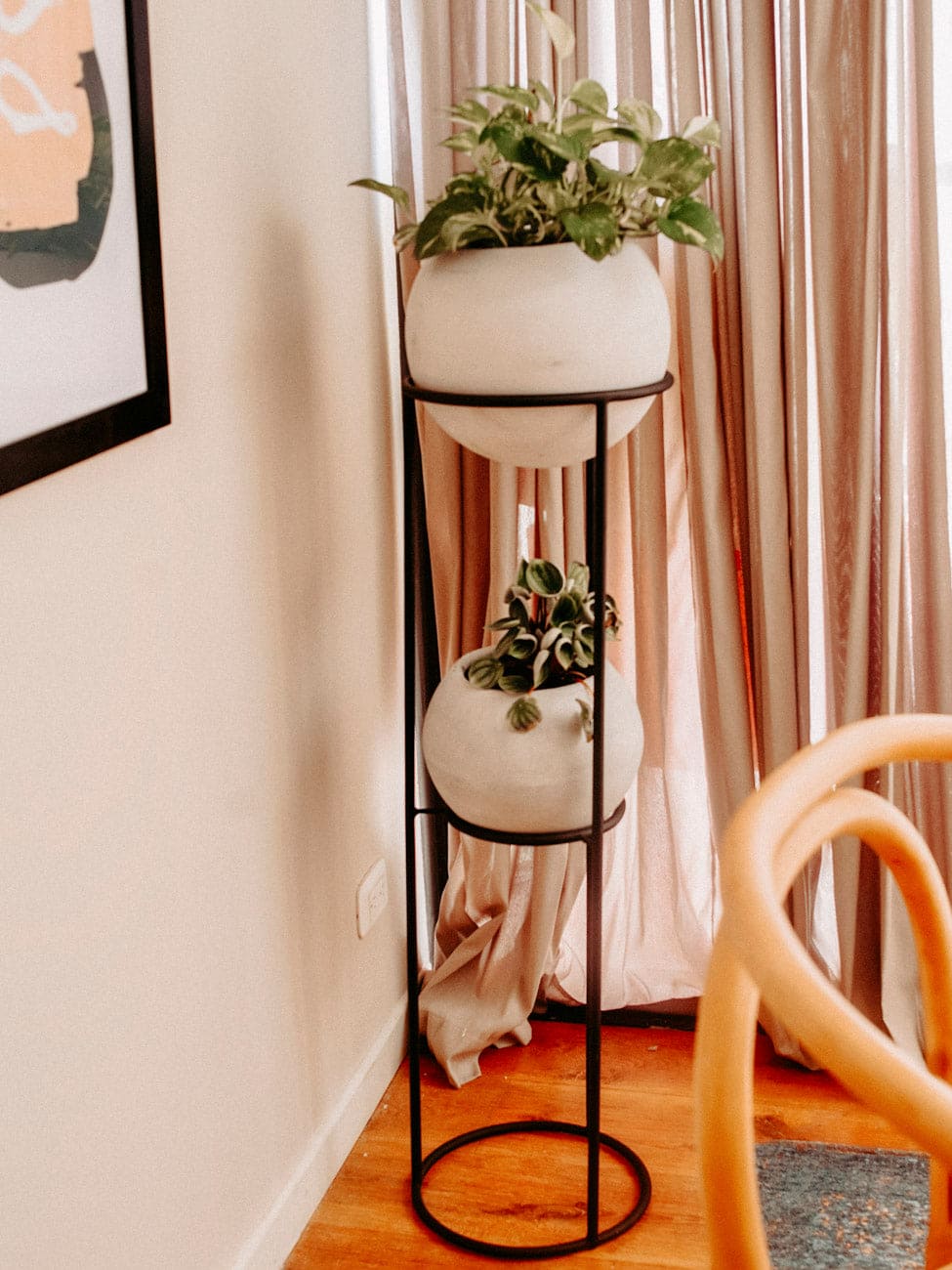Escandinavo y práctico: soporte de plantas de hierro con macetas de cemento hechas a mano en Colombia.