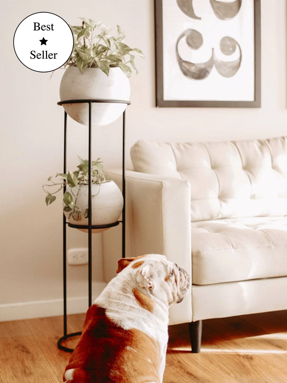 Soporte de plantas escandinavo de dos niveles elaborado en hierro, soldado a mano con pintura en polvo y baño antioxidante; la estructura presenta una construcción enjaulada que sostiene un dúo de macetas de cemento impermeable hechas por manos artesanas colombianas.