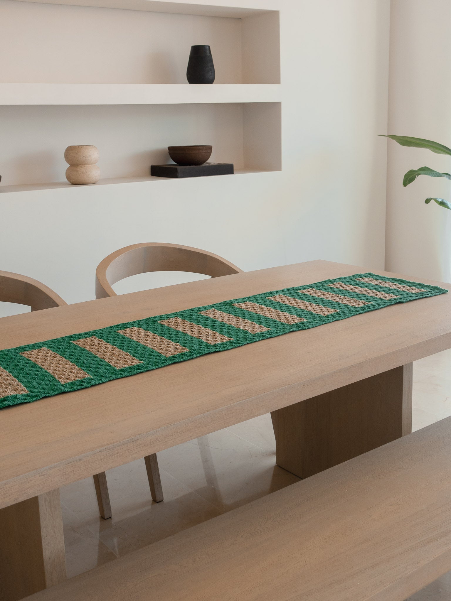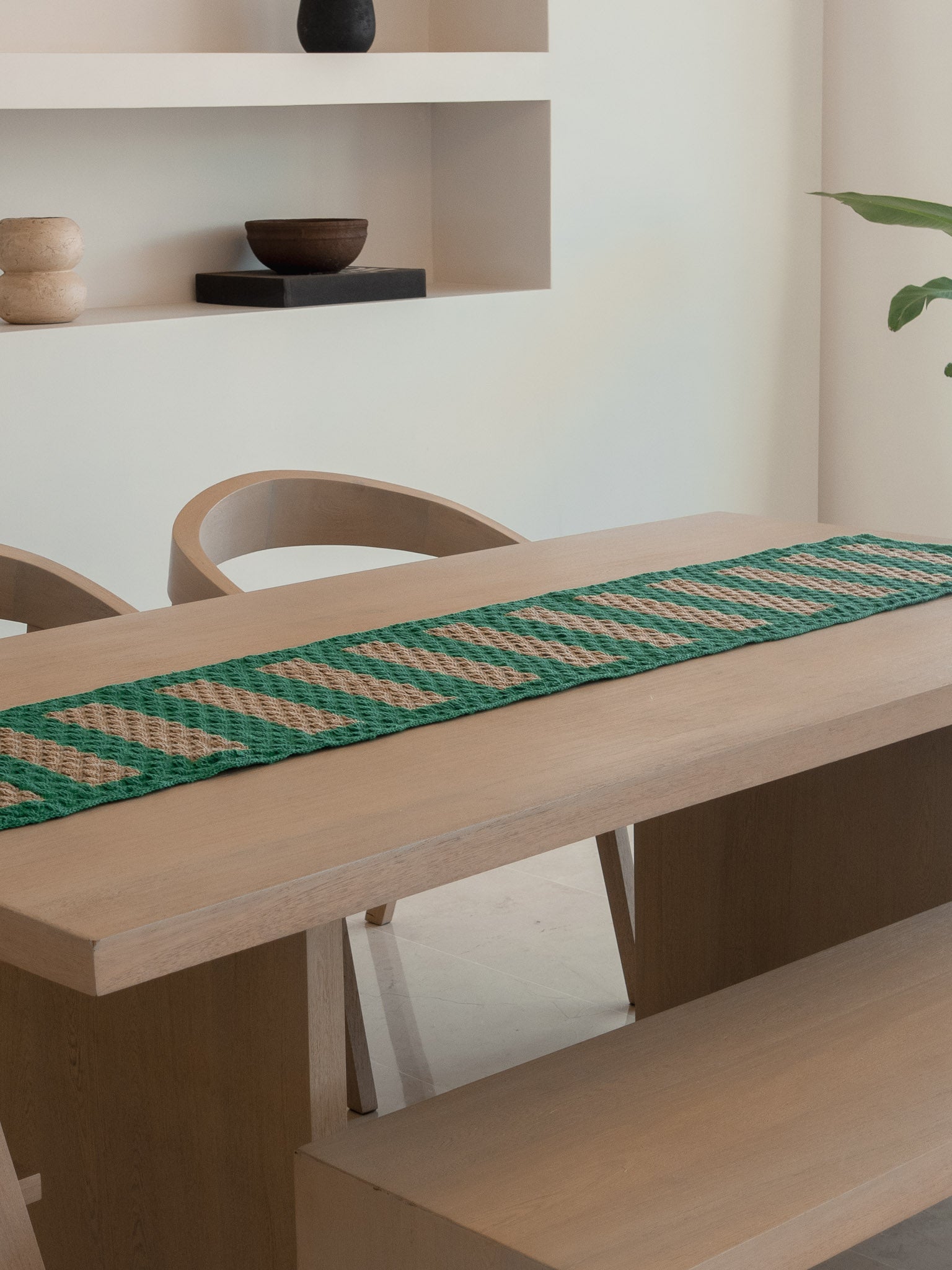 Este camino utiliza hilos de algodón en varios tonos de color Verde, creando una textura única que realza cualquier ambiente.