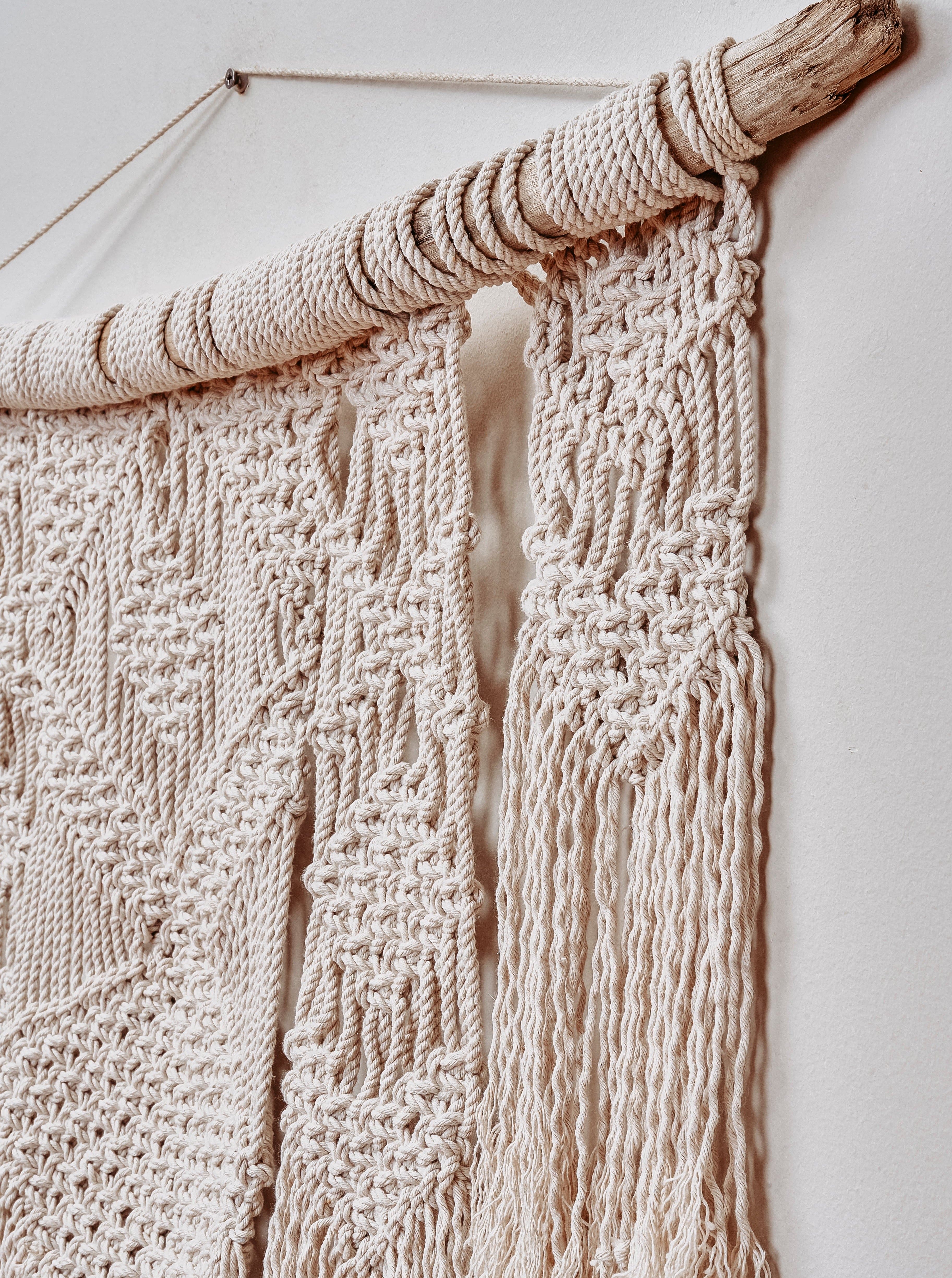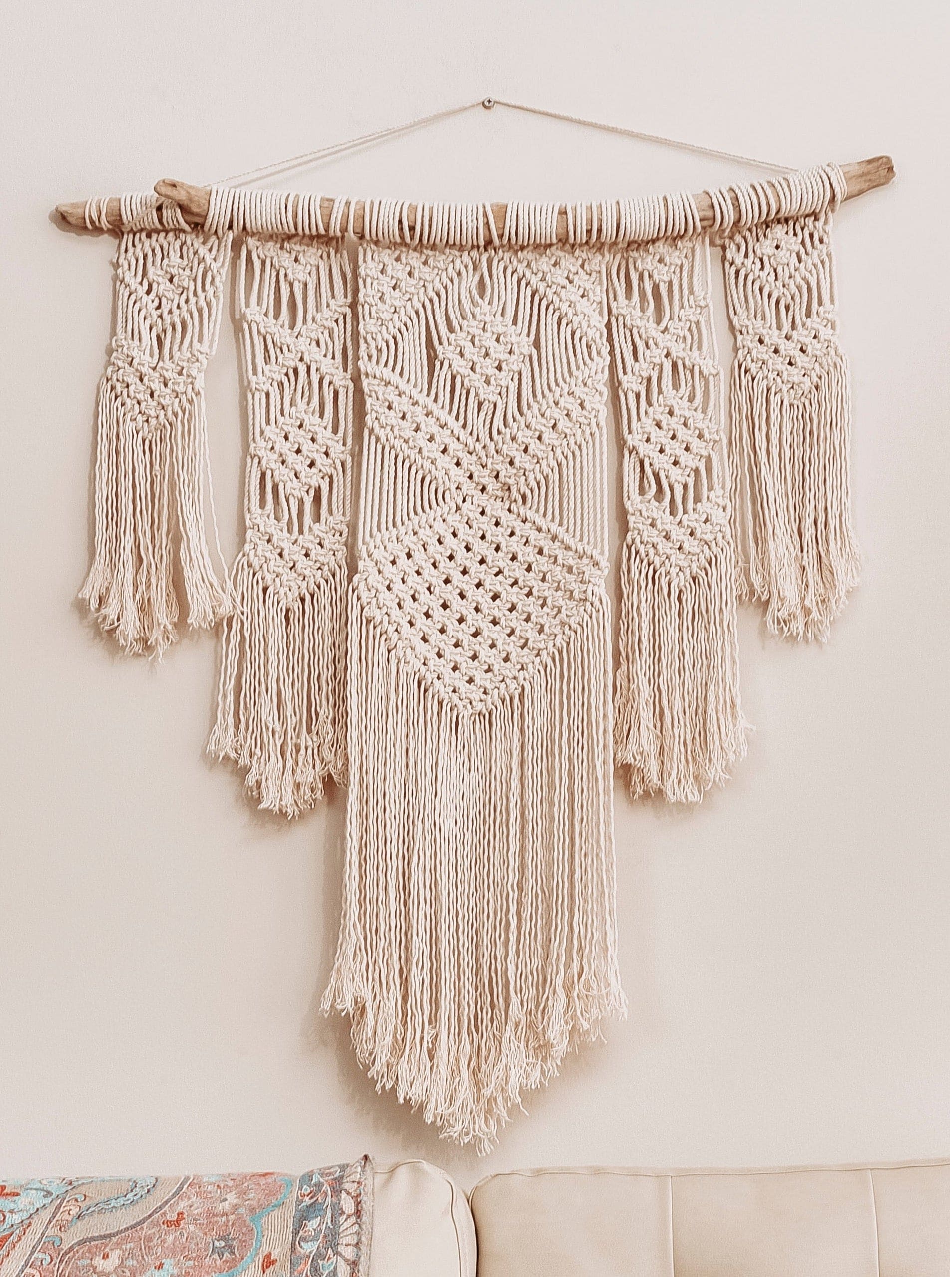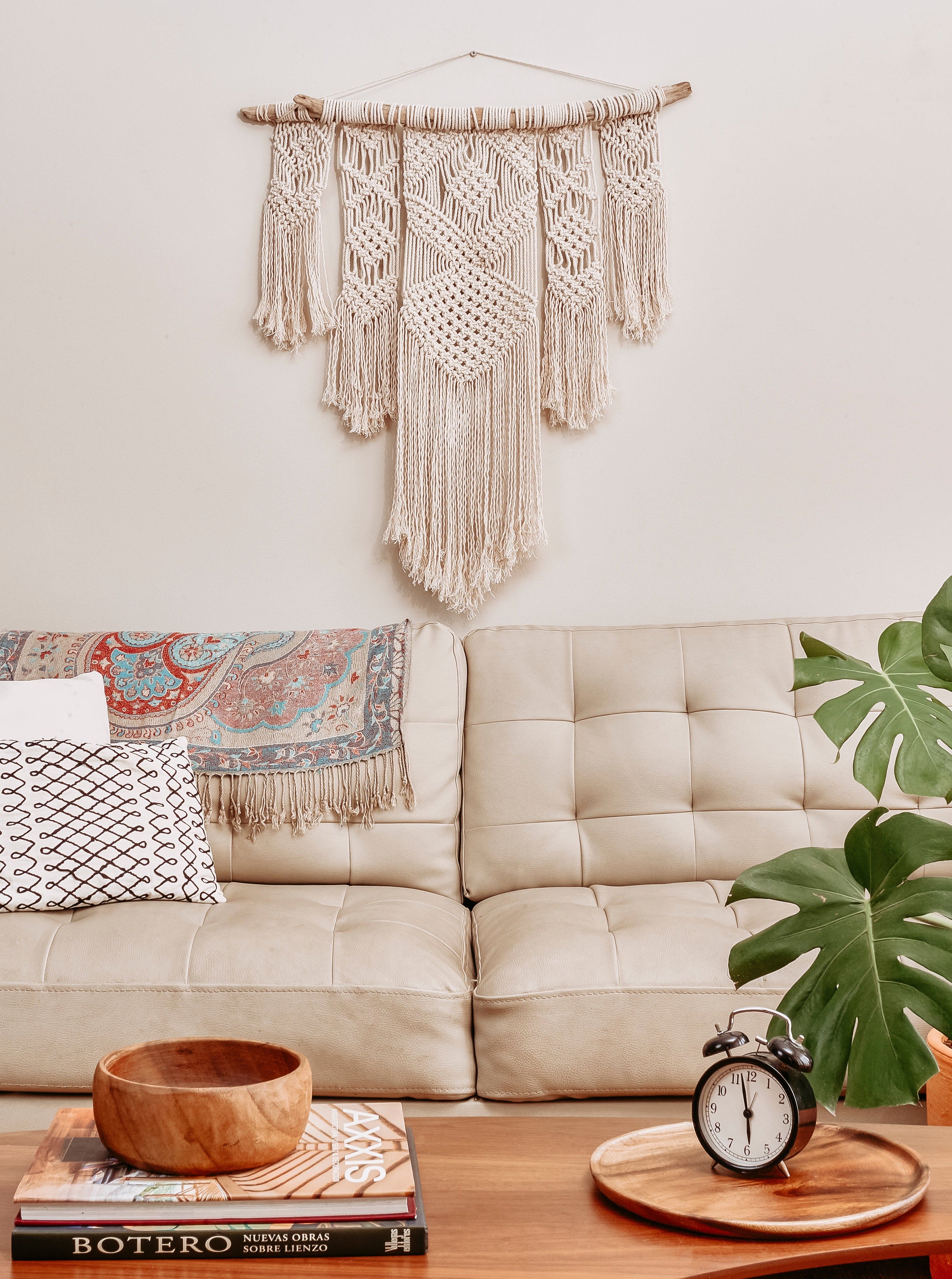 Hecho a mano por artesanas colombianas, con patrones boho y un tronco de madera recogido manualmente de las playas del Caribe colombiano. Este colgante único le dará un toque de naturaleza a tu hogar.