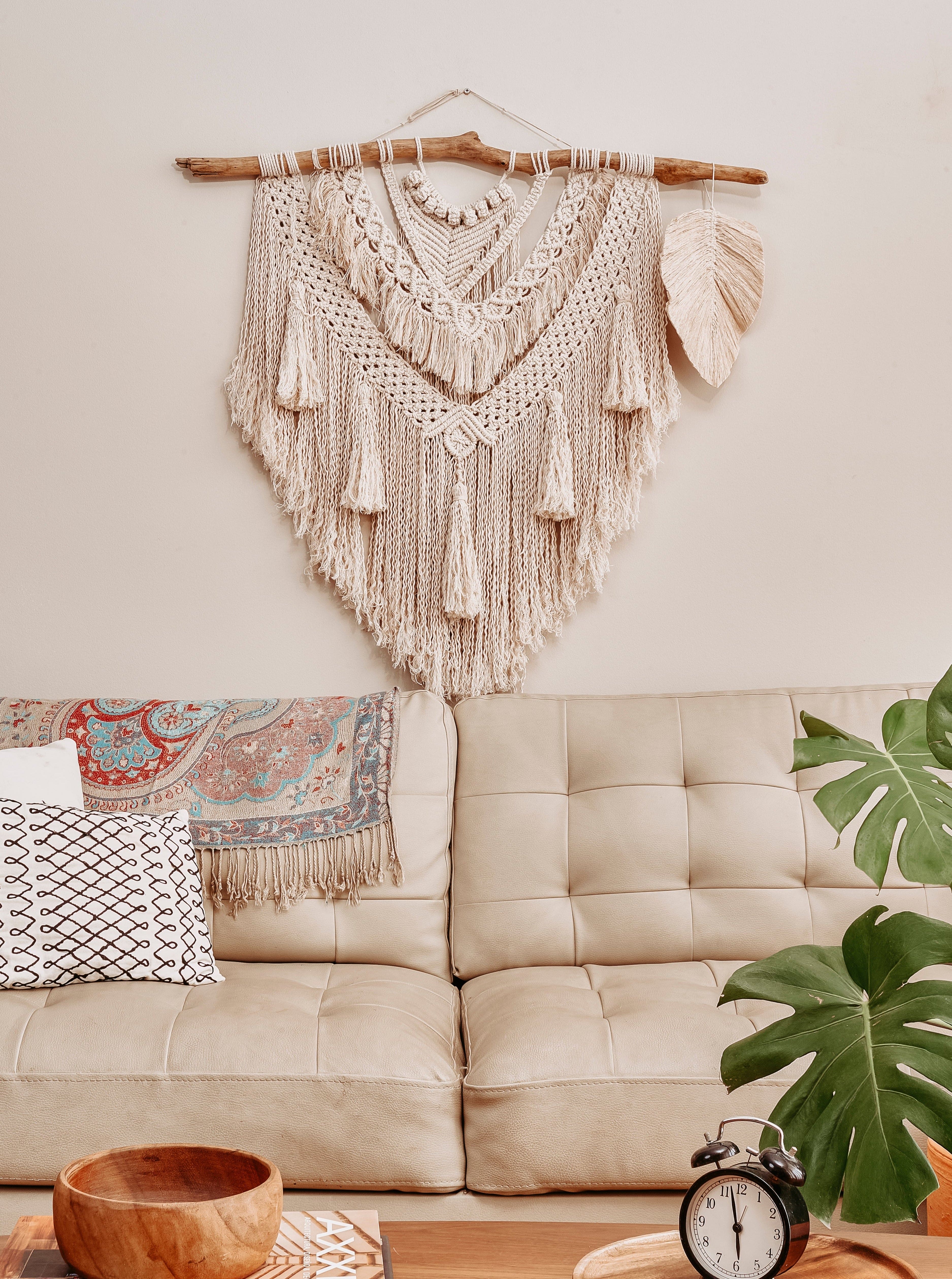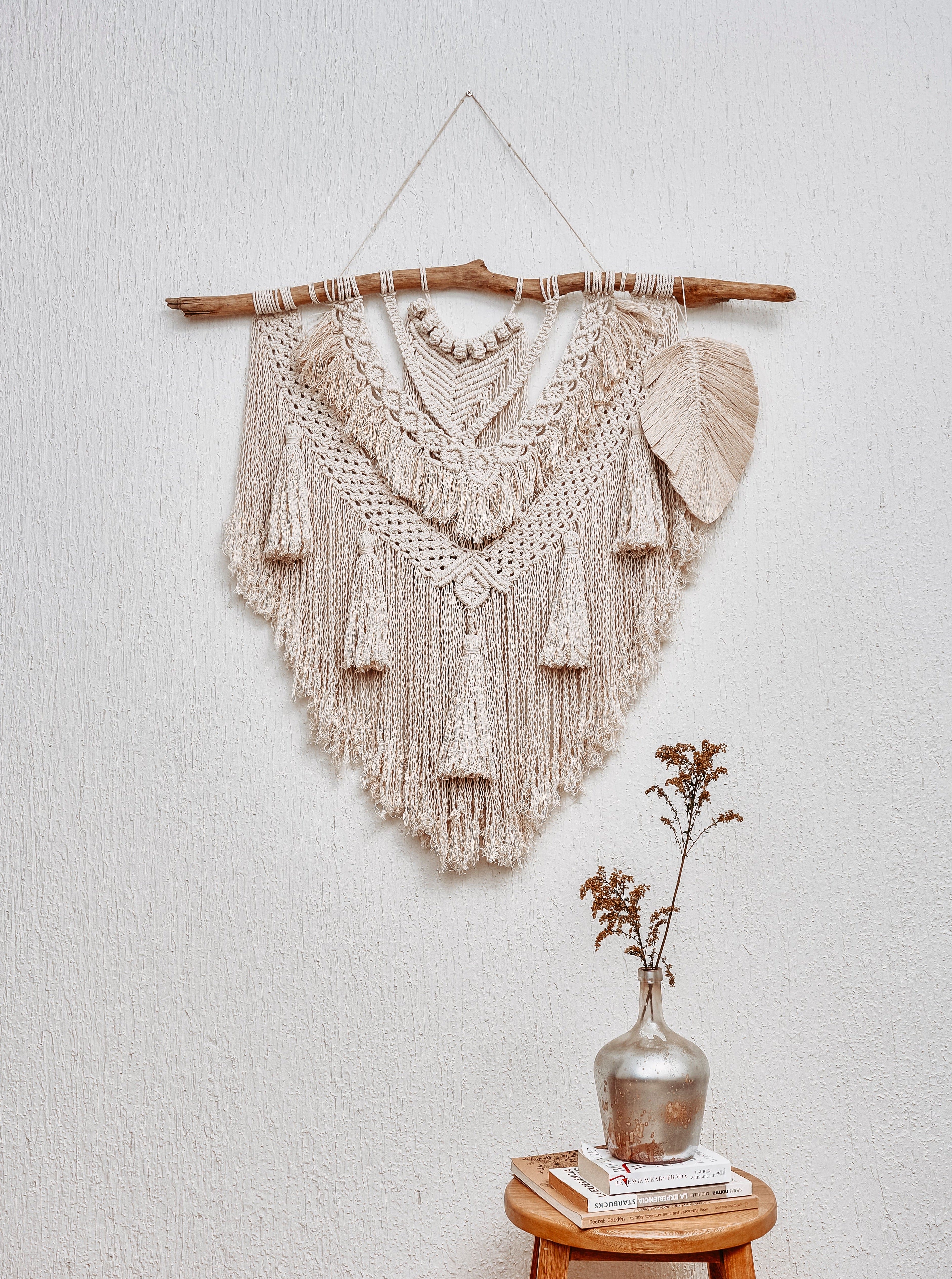 Hecho a mano por artesanas colombianas, con patrones boho y un tronco de madera recogido manualmente de las playas del Caribe colombiano. Este colgante único le dará un toque de naturaleza a tu hogar.
